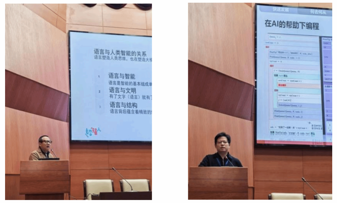 开幕式后,在AI赋能教育学术报告中,山东工艺美术学院顾群业教授分享了《超智人的探索与实践》,东南大学李骏扬教授围绕“AI时代,程序课程的冲击与响应”展开阐述,为在场代表带来了前沿的学术思考。本环节由湖南大学赵欢教授主持。