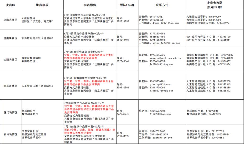为方便参赛师生,表1中汇总了参赛相关信息,详细信息请查阅2023年大赛国赛6个决赛区的参赛指南(详见表2)。
